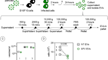 EVs were collected using differential centrifugation of conditioned media. Cells were infected at MOI 5 with MRBΔG viruses in serum-free media. After 2 h, media was changed for DMEM with exosome-depleted serum (Thermo Fisher Scientific) and the cells were incubated for 24 h at 37 °C. Samples were first subjected to 2000 × g and 12,000 × g centrifugation steps (Thermo Scientific Sorvall ST 40 R Centrifuge and Beckman Coulter Avanti J-E, respectively) to eliminate cells, cellular debris and large EVs. Small EVs were pelleted using ultracentrifugation (Beckman Coulter Optima L-100 XP Ultracentrifuge or Thermo Scientific Sorvall wX+ Ultra Series Centrifuge) at 120,000 × g for 3 h and collected in 1× PBS.