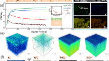 Doping the LLZOs is important to attain a high ionic conductivity of the LLZO solid electrolyte33,34,35; however, the stability of doped LLZO with Li metal may substantially differ depending on the dopants28,36,37,38. To compare the effect of the dopant on the stability, chemical colouration39 tests were performed, which visually showed the reactivity between the lithium metal and LLZO pellets (Fig. 1a; see Methods section for details). The test was performed using LLZOs with four representative dopants: Li6.5La3Zr1.5Ta0.5O12 (Ta–LLZO), Li6.25Al0.25La3Zr2O12 (Al–LLZO), Li6.5La3Zr1.5Nb0.5O12 (Nb–LLZO) and Li4.9Ga0.5La3Zr1.7W0.3O12 (Ga,W–LLZO); these dopants have been most commonly used to increase the Li-ion conductivity or density of the LLZO pellet33,34,35. The physical properties of doped LLZO electrolyte pellets such as their crystal structures, morphology with relative density, and ionic conductivity are presented in the supplementary information (Supplementary Figs. 1–4). To accelerate the potential reaction between Li metal and LLZO, the pellets were heated to 200 °C, which was close to the melting point of Li metal, over the observation period. Figure 1a shows the difference in the stabilities of the LLZOs against Li metal depending on the dopants. Initially, the Li was plainly visible beneath the thin LLZO pellet for all the samples without an apparent side reaction. In the case of Ta– and Al–LLZOs, the contact area slightly darkened over time; however, no significant change in colour was observed even after 8 h. Meanwhile, Nb– and Ga,W–LLZOs showed pronounced degradation under the same experimental conditions. The contact area of Nb–LLZO began to darken from the contact area within only 10 min, subsequently becoming black and fracturing into pieces after 1 h. This observation was consistent with those reported in prior studies, where Nb-containing garnet-type solid electrolytes discoloured after the electrochemical test, suggesting that Nb5+ could have been reduced to Nb4+38,40. Ga,W–LLZO showed more severe changes in a few minutes. In addition to the colour change, the Li metal penetrated the pellet (Supplementary Fig. 5). The reaction proceeded until the Li was completely consumed, and the entire pellet turned black with significant pulverisation. Considering that LLZOs with four different compositions did not show noticeable differences in the crystal structures, relative phase amounts, and microstructures, but only differed in the dopant characteristics, the rapid colour change and/or Li metal penetration in these experiments suggested that the LLZO with certain dopants could substantially react with Li during long-term cycling of the batteries.