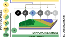 Several approaches exist to estimate E at large scales using process-based models. Some of them simulate E as a residual of the energy balance, or derive it empirically using vegetation, temperature, and radiation data. These approaches are primarily employed in high-resolution remote sensing, especially in agricultural areas, owing to its minimal input data requirements12,13. Other models employ a flux-based approach to derive E using more physically-founded methods, such as the Monin-Obukhov similarity theory, to calculate the gradients of specific humidity between the atmosphere and land surface (vegetated or non-vegetated), and explicitly model the surface resistance to the diffusion of water vapor. This approach is prevalent in climate models14. Finally, the third approach, commonly used in hydrological models15 and satellite retrieval algorithms16,17,18, involves the prior calculation of potential evaporation (Ep), a theoretical maximum for the given land cover and meteorological conditions. Subsequently, actual E is estimated by reducing Ep by a certain factor that accounts for the sub-optimal conditions of evaporation due to (e.g.,) water scarcity; this is referred to here as ‘evaporative stress’ (S), and more precisely ‘transpiration stress’ (St) when applied to plant transpiration. Independent of the approach, significant uncertainties remain in the current global estimates of E, and this applies to both climate models19 and satellite-based algorithms20.