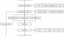 An overview of our AI system for tooth and alveolar bone segmentation is illustrated in Fig. 2. Given an input CBCT volume, the framework applies two concurrent branches for tooth and alveolar bone segmentation, respectively (see details provided in the “Methods” section). The segmentation accuracy is comprehensively evaluated in terms of three commonly used metrics, including Dice score, sensitivity, and average surface distance (ASD) error. Specifically, Dice is used to measure the spatial overlap between the segmentation result \(R\) and the ground-truth result G, defined as Dice = \(\frac{2\left|R\cap G\right|}{\left|R\right|+\left|G\right|}\). The sensitivity represents the ratio of the true positives to true positives plus false negatives. The distance metric ASD refers to the ASD of segmentation result \(R\) and ground-truth result G.