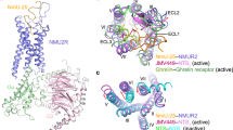 Due to the steric hindrance caused by a hydrophobic lock comprising of F2846.51, F1263.32, and Y3177.43, NMU is not able to directly contact the “toggle switch” residue W2816.48, which often undergoes a movement upon ligand binding45,46 (Fig. 4b). Alternatively, the side chain of the amidated N7U in NMU may push the side chain of R2886.55, causing it to swing away from the receptor helical core (Fig. 4c). Concomitantly, the swing of R2886.55 may lead to the conformational changes of F2846.51 and W2816.48, further leading to the swing of F2776.44 and the pronounced outward displacement of the cytoplasmic end of TM6 (Fig. 4d). The other conserved residues in “micro-switches” (ERY, PIF, and NPxxY) also undergo active-like conformational changes relative to the antagonist-bound ghrelin receptor and transmit the peptidic agonism signaling to the cytoplasmic face of the receptor to facilitate G protein coupling (Fig. 4e–g). Also, rotameric switches were caused by the conformational changes of F2846.51 and W2816.48. The repacking of the inter-helical hydrophobic contacts between TM6 and TM7 occurred that led to the inward shift of the cytoplasmic end of TM7 (Fig. 4a). The R6.55-mediated activation mechanism shared by NMUR1 is also captured in the ghrelin receptor31. and neurotensin receptor 147, probably serving as a common mechanism across other peptide GPCRs with high sequence homology with NMURs, including the motilin receptor and neurotensin receptor 2 (Supplementary Fig. 5d).