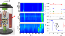 DSC measurements over the pressure range from 1 to 150 bar were carried out in a Netzsch high-pressure DSC (DSC 204 HP Phoenix) equipped with a liquid nitrogen cooling system. The DSC sample cell is surrounded by an autoclave, where the internal pressure and gas flow are regulated by an electronic pressure control device. The autoclave is connected to a circulating water bath that provides an additional source of external temperature control during experiments. Temperature and heat flow signals were calibrated at each measured pressure using an indium standard46. Helium gas (ultra-high purity, 99.999%) was used as a pressure-transmitting medium. All DSC samples were prepared in air. For powder samples, 5–10 mg of loosely packed ground single crystals were sealed in an aluminum pan with a pierced lid. For single-crystal samples, a large single-crystal flake was lightly pressed onto the bottom of an aluminum pan, which was then sealed with a pierced lid. An empty, aluminum pan with a pierced lid was used as a reference. All measurements were carried out under flowing gas with a He flow rate of 50 mL min–1. Unless otherwise noted, heating and cooling rates of 2 K min−1 were used for isobaric measurements.