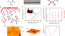 Six organic small molecule compounds, shown as 1–6 in Fig. 1a, were used to prepare the magnetic hybrid materials. The crystal structures of compounds 2, 4, 5 and 6 were reported previously20,24,42,43. While compound 1 is newly synthesized, compound 3 was reported without single crystal diffraction data44. The structures of both compounds were determined, deposited, and are available from the CCDC (codes: 2116768 and 2117194; Supplementary Figs. 1–7, Supplementary Table 1). Acicular crystals of all compounds were grown by solvent evaporation (Supplementary Fig. 8). Their lengths were at the order of centimeters, and their widths and thickness were at the order of tens to hundreds of microns (Supplementary Table 2). As shown in Fig. 1b, when subject to external force the crystals were elastic and could be bent without breaking. The mechanical properties of the crystals of 1 and 3 were characterized, and the results are available from Supplementary Fig. 9a and 9c. From the studied materials, only crystals of 4 could be bent on two of the crystals’ faces (Supplementary Fig. 10)43. This elasticity can be tentatively attributed to the extensive intermolecular interactions in their structures, such as hydrogen bonding and π—π interactions. The method for preparation of the magnetic hybrid crystals is shown schematically in Fig. 1c, d. The hybrid crystals were expected to respond when approached by a permanent magnet (Fig. 1e). To that end, the nascent organic crystals were first coated with multiple alternating polymer layers by alternative treatment with aqueous solutions of a positively charged polymer, poly(diallyldimethylammonium chloride) (PDDA) and a negatively charged polymer, poly(sodium 4-styrenesulfonate) (PSS). Typically, eight layers of each polymer were applied. The polymer-coated crystals were then affixed at both ends to a capillary glass tube (Supplementary Fig. 11), and a suspension of iron(III) oxide magnetic nanoparticles (MNPs) was aspirated with a syringe. One part of the polymer-coated crystals was spin-coated using the droplets at the tip of the syringe, whereby partially MNP-coated crystals of MNP//1–6 were obtained which had a small strip with MNP closer to one end (Fig. 1f). Figure 1g shows a scanning electron micrograph of a cross-section of the crystal, and Fig. 1h represents the cross-section of the magnetic hybrid flexible crystals MNP//1–6 schematically. To test whether there is significant alteration of the mechanical properties of the crystals after the coating with polymer and application of MNPs, the mechanical properties of crystals of 1, 3, MNP//1, and MNP//3 were determined and compared (Supplementary Fig. 9). The results confirmed that the mechanical properties of the hybrid organic crystals were essentially unchanged relative to the original crystals.