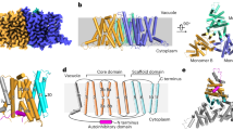 Another notable feature is that in each of the pore-forming transmembrane segment, a “helix breaker” which tends to disrupt the helical structure, either a glycine or proline residue, is identified near the middle of the helix, namely G196 in TM1, P270 in TM3, G337 in TM5, P397 in TM7 and P451 in TM9 (Supplementary Fig. 5d). Kinked helices are commonly present in channels or transporters that undergo conformational changes to regulate substrate transport. The “helix breakers” may be anchors around which the pore-forming helices rotate or twist to regulate pore opening. The P451A or P451G mutants have been previously shown to have notably impaired currents in Xenopus oocytes21. We also tested the expression and electrophysiology of P451A mutant in the HEK293 cell system. Compared with the WT AtSLAC1, the P451A mutant had a comparable protein yield and solution behavior in gel filtration (Supplementary Fig. 5e). However, the anion currents were almost completely abolished for the P451A mutant when expressed alone in the HEK293T cells (Supplementary Fig. 5f, g), similar to the results in the oocytes21, suggesting essential roles for the kinking residue during channel activation.