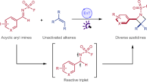 Nitrogen heterocycles are prevalent motifs in small molecule pharmaceuticals and their rapid construction continues to drive new reaction development1. While 3-, 5- and 6-membered N-heterocycles are exceptionally common, made possible by a variety of synthetically accessible routes for their construction, 4-membered heterocycles are scarce by comparison despite the promising biological activity displayed by many azetidine-containing compounds2,3,4,5,6,7. The 2 + 2 photocycloaddition of two π-components is a prototypical approach to 4-membered ring construction. While limited in generality, the Paternò-Büchi reaction forms oxetanes through direct irradiation of a carbonyl C = O double bond followed by C = C double bond capture8,9,10. Aza-Paternò-Büchi11 analogs using imines in place of aldehydes or ketones do not generally result in the formation of analogous azetidines due in part to the low barrier E/Z isomerization available upon excitation of the imine C = N double bond12. Maruoka reported a rare intermolecular azetidine-forming 2 + 2 photocycloaddition example using naphthaldehyde derived N-sulfonyl aldimines and styrene or benzofuran (Fig. 1a)13. However, this reactivity was exclusive to these substrate pairs, enabled by a π-stacking association of the substrates prior to excitation. Photosensitization of cyclic C = N double bonds which cannot undergo E/Z isomerization is one successful strategy for azetidine formation14,15,16. A recent report from Schindler and co-workers used fac-Ir(dFppy)3 (fac = facial; dFppy = 2-(2,4-difluorophenyl)-pyridine) and blue light irradiation as a photocatalyst system to selectively activate the C = N double bond of cyclic glyoxylate imines which coupled to a wide array of alkenes (Fig. 1b)16. Preferential excitation of the alkene component resulted in recent advancements in intramolecular azetidine-forming 2 + 2 photocycloadditions. Sivaguru and co-workers developed an enantioselective xanthone-mediated 2 + 2 photocycloaddition of atropisomeric enamides tethered to imines (Fig. 1c)17. Schindler and co-workers also developed an intramolecular process using [Ir[dF(CF3)ppy]2(dtbbpy)](PF6) (dF(CF3)ppy = 2-(2,4-difluorophenyl)-3-trifluoromethylpyridine; dtbbpy = 4,4′-di-tert-butyl-2,2′-bipyridine) as a photosensitizer that selectively activated vinyl arenes, leading to fused azetidine products (Fig. 1d)18. Despite these substrate-controlled advances, catalyst-controlled approaches to 2 + 2 imine-olefin photocycloaddition (IOPC) remain limited as general strategies for azetidine construction.