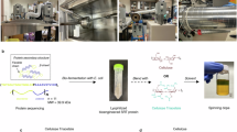The lyophilized recombinant proteins were dissolved in HFIP at a final concentration of 150 mg/mL. Five microlitre of the protein HFIP solution was then dropped onto the surface of Tris-HCl buffer in a petri dish, and then the self-assembling films forming on buffer surface were picked up with forceps and drawn into fiber (Supplementary Movie 5). In addition, to evaluate the pick speed influences on the fibers, we fabricated the protein fibers using a typical Dip Coater (MHY-08093, Beijing Meihuayi Technology Co., LTD.) at different speed (50 mm/min, 100 mm/min, and 200 mm/min) (Supplementary Movie 6). The freshly made fiber was then incubated in CaCl2 buffer for 24 h for full maturation. Recombinant protein fibers were washed with a large amount of deionized water and lyophilized for further characterization. Data are presented in Fig. 2d, Supplementary Fig. 8.