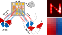 With the transversely dispersive metalens and the spectrum reconstruction algorithm, the visual information of the scene including the spatial distribution of colorful objects can be recorded by a single snapshot of SLIM with a monochrome sensor. Figure 4a, b show a scene that consists of four letters “META” in different colors placed at different spatial positions. The measurement setup is shown in Supplementary Fig. 12. The raw data captured by a monochrome sensor is shown in Fig. 4c, which consist of 48 × 48 sub-images corresponding to different view angles. Each sub-image consists of 75 × 75 pixels and contains an inverted image of the letters (see the inset of Fig. 4c). Using the reconstruction algorithm, the spectral information of each sub-image can be obtained with a spectral resolution of 8 nm (see Supplementary Note 4: Light-field-spectrum reconstruction algorithm for details). Following the conventional light-field imaging method, the 3D spatial information can be reconstructed using the sub-images21. The rendered all-in-focus image with a large depth-of-field is shown in Fig. 4d, in which all four letters are well imaged in terms of both the spatial positions and colors (spectral information). Figure 4e–h and Supplementary Movie 2 illustrate the reconstructed images at imaging depths of 69.8 cm, 57.3 cm, 45.1 cm, and 37.8 cm, which correspond to the actual positions of the four letters. Clear images of the four individual letters “M”, “E”, “T”, and “A” with blurred backgrounds can be observed, presenting the ability to extract depth information with a metalens array. Furthermore, since SLIM can present the spectrum at any part of the images of the objects, it can successfully determine the exact colors of the objects. The spectra at arbitrary parts of the four letters are shown in Fig. 4i–l, which shows good agreement with the spectra measured by a commercial spectrometer, indicating good spectrum reconstruction. The 1951 United States Air Force resolution test chart has also been used to check the resolution of our SLIM system. Group 7, element 2 of the chart has been resolved (see Supplementary Fig. 11), giving a resolution (~2.9 µm) close to the Rayleigh criterion of the proposed metalens.