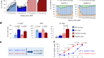 BM cells were isolated by crashing bones from the backbone, pelvis, femurs, and tibiae. Flow cytometric analyses and cell sorting were performed using monoclonal antibodies recognizing the following antigens: CD45.2 (104 1:200 dilution), Gr-1 (RB6-8C5 1:200 dilution), CD11b/Mac-1 (M1/70 1:200 dilution), Ter-119 (TER-119 1:200 dilution), CD4 (GK1.5 1:200 dilution), CD8α (53–6.7 1:200 dilution), B220 (RA3-6B2 1:200 dilution), CD127/IL-7Rα (SB/199 or A7R34 1:100 dilution), CD117/c-Kit (2B8 1:200 dilution), Sca-1 (D7 1:200 dilution), CD135/Flk2 (A2F10 1:200 dilution), CD34 (RAM34 1:50 dilution), CD150 (TC15-12F12.2 1:100 dilution), CD48 (HM48-1 1:200 dilution), and CD16/32 [FcγRII-III (93 1:100 dilution)]. These antibodies were purchased from BD BioSciences, eBioScience, BioLegend, TOMBO, or R&D Systems. Cells were incubated with a mixture of biotin-conjugated monoclonal antibodies against lineage (Lin) markers including Gr-1, Ter-119, B220, CD4, CD8, and IL-7Rα (SB/199) (anti-IL-7Rα was removed from the mixture for CLP staining). Cells were stained further with fluorochrome-conjugated streptavidin and a combination of mAbs as follows: HSCs and MPPs; PerCP-5.5-Streptavidin, fluorescein isothiocyanate (FITC)-anti-CD34, phycoerythrin (PE)-anti-CD150, PE-Cy7-anti-Sca-1, Allophycocyanin (APC)-anti-c-Kit, APC-Cy7-anti-CD48, and Brilliant violet 421-anti-Flt3. GMPs and MEPs: APC-Cy7-streptavidin, FITC-anti CD34, PE-anti-FcγR, PE-Cy7-anti-Sca-1 and APC-anti-c-Kit. CLPs: PerCP-5.5-streptavidin, PE-anti-IL-7Rα (A7R34), PE-Cy7-anti-Sca-1, APC-anti-c-Kit, and Brilliant violet 421-anti-Flt3. Dead cells were removed by staining with 0.5 μg/mL propidium iodide (Sigma-Aldrich). All flow cytometric analyses and cell sorting were performed on FACS Aria III, FACS Canto II, or FACSCelesta (BD). Gating of young and aged HSPCs are indicated in Supplementary Fig. 13.