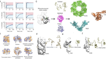 We simulated Luciferase’s synthesis, ejection from the ribosome exit tunnel, and post-translational dynamics using a coarse-grain representation of the protein and ribosome (Fig. 1a–c, Supplementary Table 1, “Methods”, and Eqs. (1) and (2)). Fifty statistically independent trajectories were run. To characterize Luciferase’s native conformational ensemble we also simulated ten trajectories initiated from Luciferase’s crystal structure, which we refer to as “native-state simulations”. To assess whether or not a given Luciferase trajectory is misfolded we utilize the time-dependent mode of the fraction of native contacts (\({Q}_{{{{{{\rm{mode}}}}}}}\)) and the probability that a non-native entanglement (\(P\left({G}_{k}\right)\)) has formed. We categorize a trajectory as misfolded if it has (i) a mean \({Q}_{{{{{{\rm{mode}}}}}}}\), over the final 100 ns of the post-translational phase of the simulation, that is less than the average from the native-state simulations, or (ii) a mean \(P\left({G}_{k}\right)\) for the different possible changes in non-covalent lasso threading denoted \(k=\{{{{{\mathrm{0,1,2,3,4}}}}}\}\) of 0.1 or greater over the final 100 ns of the trajectory, or (iii) both (i) and (ii) occur (see “Methods”). Conditions (i) and (ii) correspond to perturbations of structure relative to the native state as defined by the fraction of native contacts and entanglement, respectively. Based on this definition, 46% (95% Confidence Interval [32%, 60%], calculated from bootstrapping 106 times) of nascent Luciferase molecules misfold (Fig. 1d, e, “Methods”). We observe that when Luciferase misfolds, it misfolds 100% of the time in the second domain (based on \(\langle {Q}_{{{{{{\rm{mode}}}}}}}\rangle\)), which is composed of residues 13–52 and 212–355. These misfolded Luciferase structures are near-native, with a 5.5% decrease in the overall fraction of native contacts (\(\langle {Q}_{{{{{{\rm{overall}}}}}}}\rangle =0.86\), computed over the final 100 ns of misfolded trajectories) compared to the native ensemble (\(\langle {Q}_{{{{{{\rm{overall}}}}}}}\rangle =0.91\)). Thus, a large proportion of nascent Luciferase misfolds into near-native conformations that typically involve misfolding of the second domain.