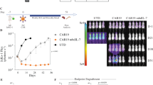 To ensure that these dose-sparing effects of rhIL-7-hyFc were also applied to human CAR T cells, we injected RamosCBR-GFP engrafted NSG mice with limiting doses of UCART19 starting at 5 × 104 cells followed by rhIL-7-hyFc treatment. Similar to the murine CAR T cell studies, the 5 × 104 dose UCART19 did not have any effect on the tumor even with the addition of rhIL-7-hyFc. However, 2.5 × 105 UCART19 cells combined with rhIL-7-hyFc achieved tumor control in 3/5 mice, in contrast to mice given 2.5 × 105 UCART19 alone, where all mice had rapid tumor progression and died. As expected, the highest dose of 1.25 × 106 UCART19 in combination with rhIL-7-hyFc mediated tumor regression in all mice (Fig. 6f). Again, the degree of tumor control and survival seen with 2.5 × 105 UCART19 combined with rhIL-7-hyFc surpassed that seen with fivefold higher doses of UCART19 alone, indicating that rhIL-7-hyFc may allow for treatment with much lower CAR T cells doses than conventionally used, and still lead to better outcomes.