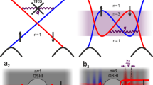 a Edge segment of a generic 2D TI material. A pair of helical edge states is bound to the edge. Back-scattering from defects such as the edge kinks is impeded by topologically protected spin-momentum locking, i.e., left-moving spin-up states (blue) cannot scatter with right-moving spin-down states (red). The corresponding one-dimensional band structure is schematically depicted below, where the arrows represent the electron spin projection and the wavy line indicates (prohibited) single-particle backscattering. b Two opposing edge segments in close proximity. Spatial overlap of both pairs of helical edge states induces hybridization (or tunneling) between both edges, thereby allowing inter-edge scattering from one segment to the other across the boundary. Strikingly, this opens a channel for back scattering from the edge kinks, i.e., the topological protection becomes partially lifted due to inter-edge hybridization. The corresponding band structure and the now allowed single-particle backscattering is depicted below. c Tight-binding model of coupled edge states in the 2D TI bismuthene. The white area indicates a topologically trivial line defect along the x-direction embedded in the topological bulk (light brown). The green and pink boundaries of the finite-size bulk are connected via periodic boundary conditions, resulting in the depicted torus. The trivial line defect connects two opposite edges; the resulting wave function overlap between both sides induces hybridization of like-spin edge states across the line defect (y-direction) as in b. d Energy-dependent LDOS of the tight-binding model along the line defect in c (integrated across its y-width). The line defect induces standing wave excitations bound to its longitudinal extent (along x) and, as the underlying helical states of bismuthene exhibit an approximate linear dispersion, are linearly quantized in energy E. For details of the calculation see Supplementary Sec. F.