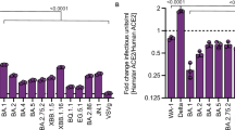 Viral genome sequences were determined using Illumina deep-sequencing as described before51. The 614 G virus contained a spike S686G change in 48% of reads compared with the passage 1 (kindly provided by Dr. Christian Drosten) and no other variants >40%. The VOC Gamma, Delta and Omicron variant passage 3 sequences were identical to the original respiratory specimens and no minor variants >40% were detected. For VOC Omicron, the S1 region of spike was not covered well, due to primer mismatches. Therefore, the S1 region of the original respiratory specimen and passage 3 virus were confirmed to be identical by Sanger sequencing. VOC Gamma contained the following spike changes: L18F, T20N, P26S, D138Y, R190S, K417T, E484K, N501Y, D614G, H655Y, T1027I, V1176F. VOC Delta contained the following spike changes: T19R, G142D, del156–157, R158G, A222V, L452R, T478K, D614G, P681R and D950N. VOC Omicron contained the following spike mutations: A67VS, del69–70, T95I, G142-, del143–144, Y145D, del211, L212I, ins215EPE, G339D, S371L, S373P, S375F, K417N, N440K, G446S, S477N, T478K, E484A, Q493R, G496S, Q498R, N501Y, Y505H, T547K, D614G, H655Y, N679K, P681H, N764K, D796Y, N856K, Q954H, N969K, L981F. The VOCs Gamma, Delta and Omicron sequences are available on Genbank under accession numbers OM442897, OM287123, and OM287553, respectively.