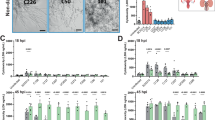HeLa cells or Caco-2 cells were infected with C. albicans BWP17 wild-type strain at MOI 0.1 (7 × 103 cell per well) and MOI 1 (7 × 104 cell per well), as described above (see Infection procedure). LDH release during infection was measured at 3, 6- and 24-h post-infection using the CyQUANT™ LDH Cytotoxicity Assay Kit (Invitrogen) by following the manufacturer’s instructions. As controls, LDH release was measured in the surrounding medium of epithelial layers incubated with growth medium alone (background cells) and from wells without epithelial layers but seeded with C. albicans cells in growth medium (background C. albicans). Additionally, the maximal LDH release of epithelial cells was obtained by treatment with 1% Triton X-100 to each well and vigorously disrupting the epithelial layer with a pipette tip 1 h before each measured timepoint. The cytotoxicity percentage of epithelial cells infected with C. albicans BWP17 wild-type strain was calculated as previously described14: