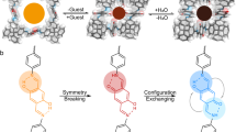 A dicationic tetraaldehyde precursor 12+·2Br– and (1S,2S)-(+)-1,2-diaminocyclohexane ((SS)-CHDA) were combined (Fig. 1A) in a 1:2 ratio in H2O (1 mL). Here, H2O was employed instead of D2O, in order to avoid deuteration. After the mixture was heated at 80 °C for 12 h, the solution was cooled down to room temperature. CD3SOCD3 (0.33 mL) was then added to the aqueous solution in order to perform 1H NMR spectroscopic experiments. Both 1H NMR spectrum (Fig. 2C) and ESI-HRMS (Supplementary Fig. S14) were recorded. ESI-HRMS reveals that a product, namely S-26+, containing three equivalents of 12+ and six equivalents of (SS)-CHDA, was obtained as the major product. Two predominant peaks corresponding to [2 – H]5+ and [2 + Br]5+ were observed in the mass spectrum (Supplementary Fig. S14). The 1H NMR spectrum shows a set of sharp resonances (Fig. 2C), indicating that the structure of S-26+ is highly symmetrical. The assignments were confirmed by two-dimensional NMR spectroscopy (Supplementary Figs. S6–S13). The resonance corresponding to the proton f in the biphenyl protons undergoes a significant upfield shift of around –2.4 ppm compared to the corresponding resonance in the precursor 12+ (Fig. 2B). This result indicates that the biphenyl unit is buried deeply within the framework of S-26+ and therefore experiences a shielded magnetic environment. Only one resonance was observed corresponding to each proton in the biphenyl units including either g or f, indicating that the biphenyl units in the framework of S-26+ undergo fast circumvolution around the –biphenyl– axis on the 1H NMR timescale. No other products in substantial amounts were observed in the 1H NMR spectrum. The 2D DOSY spectrum (Fig. 2D) demonstrates that all resonances of S-26+ have the same diffusion coefficient. By using the Stokes–Einstein equation, the hydrodynamic diameter of S-26+ was calculated to be ~2.6 nm. In the framework of S-26+, the protons e/e’ become diastereotopic in the 1H NMR spectrum, revealing the chirality of the knot. In addition, the resonances corresponding to protons including either c/c’ or h/h’ also split into two peaks. This observation results from the fact that the two imine bonds grafted on a phenyl unit adopt two different orientations.