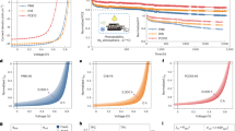 Figure 3c shows the experimental and simulated capacitance–voltage curves under 1 sun illumination, from a negative voltage to just over Voc. At large negative voltages the electric field between the contacts sweeps carriers out of the device quickly, thus the capacitance tends towards the geometric capacitance. In this region the values of capacitance are very close to one another, suggesting no significant change in the structure of the device upon aging. As the voltage increases from negative to positive, the field between the contacts drops, diffusion currents start to dominate drift currents, and charge carriers start to interact with trap states. Examining the range −1 to 0.5 V, it can be seen that the capacitance of the 96 h aged device increases most rapidly as the voltage is swept from negative to positive, followed by the 24 h aged device and then the fresh device. This suggests that the trapping density increases as a function of aging duration16.