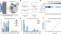 The group of betalains includes two categories of compounds, the purple-red betacyanins and the orange betaxanthins (Fig. 3a). To produce the betacyanin betanin in yeast, we introduced the tyrosine hydroxylase/cyclase from B. vulgaris (BvCYP76AD1), the DOPA dioxygenase from Mirabilis jalapa (MjDOD), and the DOPA-5-glucosyltransferase from B. vulgaris (BvDOPA5GT)46 to construct biosensor strain KM204 (Fig. 3a and Supplementary Table S1). In this strain, MjDOD serves as the effective reporter gene controlled by the pheromone responsive PFIG1 promoter, whereas BvCYP76AD1 and BvDOPA5GT were constitutively expressed. When KM204 was grown on agar plates containing 1 μM CP55940, red-colored colonies were clearly visible suggesting that the biosensor was functional (Supplementary Fig. 8). However, color build-up in liquid cultures of KM204 was very slow, suggesting that although using betanin as reporter could be useful in library screening experiments, a faster responding reported would be preferable for other applications such as, for example, a portable biosensor. Thus, we turned to the yellow betaxanthins and constructed a biosensor strain (KM205) co-expressing MjDOD controlled by the PFIG1 promoter together with the tyrosine hydroxylase BvCYP76AD5 from B. vulgaris (Fig. 3a), as this combination has been shown to produce betaxanthins in yeast46. This time, in addition to obtaining yellow-colored colonies on CP55940-containing agar plates (Supplementary Fig. 8), measuring the absorbance of the KM205 culture supernatant showed a dose-dependent biosensor signal (Supplementary Fig. 9).