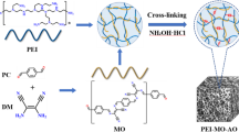Deployable polymeric adsorbents were then prepared by electrospinning (Fig. 7c). The morphology of the electrospun nanofibrous membranes (ENMs) was characterized, showing that the nanofibers of the PAN (Fig. 7d) and PANm-b-PPEGMAn (Fig. 7f) had a similar average diameter of ~800 nm. The latter exhibited rough surfaces with some “brush-like” structures. This should be attributed to the microphase separation in the block copolymer nanofibers containing a substantial amount of hydrophilic PPEGMA chains. Subsequently, the ENMs were subjected to hydroxylamine treatment and the cyano (CN) groups were converted to the AO groups. After hydroxylamine treatment, the morphologies of the PAO (Fig. 7e) and PAOm-b-PPEGMAn (Fig. 7g) nanofibers were well-preserved. For the PAOm-b-PPEGMAn nanofibers, due to the solvation effect in the alkali treatment process further promoting the microphase separation, rougher surfaces with more significant “brush-like” structures were observed under SEM. Fourier-transform infrared spectroscopy (FT-IR) was used to examine the conversion of the CN groups to AO groups40. After hydroxylamine treatment, the distinctive band of the CN groups (C≡N stretching vibration) at 2446 cm−1) completely disappeared. Meanwhile, the peak of C=N (1638 cm−1), C-N (1381 cm−1), and N–O (933 cm−1) in AO groups showed up (Supplementary Fig. 7). This suggested that the CN groups in the ENMs were completely converted to AO groups.