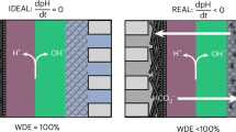 Additional work is needed to fully understand the WD mechanism in BPMs. Particularly useful would be experiments to map the concentration profiles of H+ and OH− and the electric field within the BPM junction and correlate this to WD rates. Measuring such profiles for WD catalysts of different compositions and layering schemes would be useful to understand the molecular details of the catalysis process, including the specific chemical sites where WD occurs. Studying the reverse reaction, H+ and OH− recombination, and whether that process can also be catalyzed following the same mechanistic principles as WD is also of fundamental interest and important for new BPM applications. Such advances are central for the design of optimized WD catalysts and BPMs based on the electronic, ionic, surface-chemical, transport, and other materials properties. Finally, the high current density and low resistance of the BPM electrolyzers reported here using only earth-abundant WD catalysts are impressive in their own right. This will be likely to benefit the applications highlighted in the introduction, among others. Further improvements are expected by combining optimized catalytic layers with 3D interpenetrating BPM junctions developed by others34.