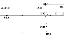 For convenience in the security proof, we slightly modify the scheme described in Box 1. First, we assume that the random phase of each mode is discretely chosen from a set of D phases, evenly distributed in [0, 2π). We expect the corresponding correction term in the security analysis due to the discretisation effect to be negligible45,46. Second, in the security proof, we modify the phase encoding and postprocessing procedures, as shown in Table 1. In the original scheme, Alice modulates A1 and A2 based on two random phases \({\phi }_{1}^{a}\) and \({\phi }_{2}^{a}\), respectively. During the X-basis processing, she calculates the relative phase difference \({\phi }_{\delta }^{a}:= {\phi }_{2}^{a}-{\phi }_{1}^{a}\) and splits it into an alignment angle θa in the range of [0, π) and a raw key bit κa. We modify these procedures as follows: in addition to the two random phases \({\phi }_{1}^{a}\) and \({\phi }_{2}^{a}\), Alice also generates two bits \({z}_{1}^{^{\prime\prime} }\) and \({z}_{2}^{^{\prime\prime} }\) and applies extra phase modulations of \({z}_{1}^{^{\prime\prime} }\pi\) and \({z}_{2}^{^{\prime\prime} }\pi\) to A1 and A2, respectively. During the X-basis processing, she calculates the relative phase difference \({\phi }_{\delta }^{a}:= {\phi }_{2}^{a}-{\phi }_{1}^{a}\) and directly announces it for alignment-angle sifting. In the Supplementary Information, we prove the equivalence of these two encoding methods.