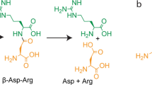 The structures suggest that the N domain possesses endo-cyanophycinase activity. To directly observe this activity, we incubated purified cyanophycin with SuCphA1 and examined the reaction with SDS-PAGE (Supplementary Figs. 5a and 7). A slow but clear decrease in cyanophycin is observed over several days, especially in the molecular weight range of ~15–20 kDa. We next performed mass spectrometry-based cyanophycin cleavage assays. Incubation of SuCphA1 with (β-Asp-Arg)8-NH2 over several hours led to the gradual formation of species with mass values corresponding to (β-Asp-Arg)4-NH2 and (β-Asp-Arg)4 (Fig. 4a). Likewise, (β-Asp-Arg)8-Asn is converted by SuCphA1 to species with masses corresponding to (β-Asp-Arg)4-Asn and (β-Asp-Arg)4 (Fig. 4b). Control reactions with primer-dependent TmCphA1 or the N domain SuCphA1(E82Q) variant with (β-Asp-Arg)8-NH2 or (β-Asp-Arg)8-Asn did not result in the appearance of the product peaks (Supplementary Fig. 5b). SuCphA1 cleaved (β-Asp-Arg)12 into major products (β-Asp-Arg)8 and (β-Asp-Arg)4, and minor products (β-Asp-Arg)5 and (β-Asp-Arg)7 (Supplementary Fig. 5c–e). Thus, the N domain of SuCphA1 is indeed a cryptic primer-generating endo-cyanophycinase that possesses a low catalytic rate and, at least with the cyanophycin segments used in these experiments, preferentially yields (β-Asp-Arg)4 fragments as products.