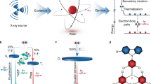 To probe the underlying mechanism of phosphorescent scintillation by X-ray irradiation in organic copolymers, we designed and synthesized other two control polymers PAA and PBPh. In monomer BPh, the bromine atom was substituted by a hydrogen atom (Supplementary Figs. 6–8, 18–19 and Supplementary Table 2). As shown in Fig. 3a, we first made a comparison on the X-ray absorption coefficients of monomers BBr (Zmax = 35, Kα = 13.5 keV), BPh (Zmax = 8, Kα = 0.525 keV), and acrylic acid (Zmax = 8, Kα = 0.525 keV), respectively50. It was found that bromine atom-containing monomer BBr displayed a larger X-ray absorption coefficient than the other two monomers within the energy region from 1 to 1,000 keV, confirming the effect of bromine atoms in effective absorbing X-ray photons. This trend matches well with their corresponding radioluminescence experiments under the irradiation of a dose rate of 278 μGy s−1 (insert in Fig. 3a). Compared with the control polymers PAA and PBPh, the phosphorescent proportion of copolymer PBBr exhibited a remarkable enhancement in the X-ray-excited luminescence spectrum. Meanwhile, the PAA film was hardly observed any obvious optical signals from the RL spectrum due to the absence of X-ray responsive chromophores. These results suggest that the bromine atoms play a vital role in the process of X-ray absorption to populate triplet excitons for generating phosphorescent radioluminescence.