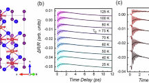 Bulk-like flakes of CrI3, grown using chemical vapor transport, were deposited onto an Au coated sample holder and placed in a variable temperature liquid helium flow optical cryostat. Ultrafast pulses were supplied by a regeneratively amplified Ti:Sapphire laser, which generated \(1.55\,{{{{\rm{eV}}}}}\) pulses (\(800\,{{{{\rm{nm}}}}}\) central wavelength) with an \(85\,{{{{\rm{fs}}}}}\) duration (measured at the sample position) at a \(100\,{{{{\rm{kHz}}}}}\) repetition rate. The beam was split into pump and probe arms using a plate beam splitter. The pump beam was sent through a mechanical delay line, and both beams were passed through achromatic wave plates and subsequently focused onto optically flat regions of the sample at near-normal incidence using a 20X near-IR optimized apochromatic objective. The nominal \(1/{e}^{2}\) focal spot diameter of the probe was approximately 10–15 μm, and the pump was approximately 20 μm, yielding a pump fluence of \({\sim} 0.64\,{{{{\rm{mJ/cm}}}}}^{2}\). The latter was just below the damage threshold of the sample (i.e., yielding no observable signal degradation or photodarkening of the sample), while also being the lowest fluence we could utilize while still maintaining a sufficient ratio with respect to the probe fluence. We performed experiments where the pump polarization was horizontally polarized (i.e., parallel to the optical table surface), right circularly polarized, and left circularly polarized. The probe beam was linearly polarized, and upon reflection, the beam was decomposed into its two orthogonal linear components using a Wollaston prism. These components were then differentially detected using a balanced Si photodiode detector and the output signal was fed into a lock-in amplifier to isolate the TRPR signal. Both the pump and probe beams were modulated using a 7/5 slotted optical chopper, allowing the lock-in amplifier to be referenced to the sum inter-modulation frequency (\(1.2\,{{{{\rm{kHz}}}}}\)) to eliminate pump scattering effects.