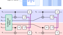 The quantum processor on which we run our QCA simulations is a 53-qubit superconducting processor, Weber, which follows the design of the Sycamore architecture outlined in ref. 20 (see also Supplementary Note 2). Typical performance characteristics for Weber are: single-qubit gate error e1 ≈ 0.1%, two-qubit gate error e2 ≈ 1.4%, \(\left|0\right\rangle\)-state readout error er0 ≈ 2%, \(\left|1\right\rangle\)-state readout error er1 ≈ 7%, and population relaxation time \({\tilde{T}}_{1}\, \approx \, 15\, \mu s\)31. Fig. 1d shows the decomposition of a single QCA cycle (red box) to the native \({\sqrt{{{\mbox{iSWAP}}}}}^{{{{\dagger}}} }\) two-qubit and PhXZ(a, x, z) ≡ ZzZaXxZ−a family of single-qubit gates. Strictly speaking, the native two-qubit gate is better modeled by \({\sqrt{{{\mbox{iSWAP}}}}}^{{{{\dagger}}} }\times {{\mbox{CPHASE}}} \, (\varphi )\), where the parasitic cphase is φ ≈ π/2321. We apply a suite of low-overhead circuit optimization, calibration, and error mitigation techniques to optimize circuit performance including moment alignment, spin-echo insertion, Floquet calibration21,24, parasitic cphase compensation, and most importantly, post-selection (see Supplementary Note 4).