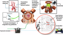 Accessing the vascular system by microcatheters has offered new opportunities in minimally invasive diagnostic and targeted therapeutic procedures, which have been extensively used clinically in recent decades1. However, catheters have limited safe access into the distal vascular routes due to various factors2,3,4,5. First, the longer access route from the arterial puncture sites (radial artery or femoral artery), the vessel tortuosity, and the smaller vessels with thinner vessel walls increase the challenges of safely navigating and pushing the catheter into these regions without causing injuries3,4, by either manual1,5 or robotic insertion6. Second, some vascular lesions, such as thrombotic diseases and arteriosclerosis, decrease or even block the blood flow in arteries, making it impractical to utilize the flow to advance the catheter to the target position4.