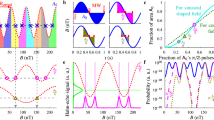 In Fig. 2a, b, we compare the regular interferometry (single driving field) and with the measurements obtained from the QPSD readout described above. Both the readout spectra and the responses to the test fields are plotted in the figures. The strength of the applied external ac fields ranges from 0 to 3 μT. For Ramsey measurements, the applied fields are at a frequency of 46 Hz, and we use a field sensing time Tϕ,Ramsey = 6.25 μs. For Hahn-echo measurements, we use external fields at 80.046 kHz and the field sensing time Tϕ,Hahn = 2Tϕ,Ramsey. The signal readout of the regular interferometry measurements is proportional to \(\sin \phi\), where ϕ ∝ γeB is the quantum phase. Thus, the regular Ramsey and Hahn-echo readout quickly saturate because the response is linear only when ϕ is small. In the spectra, harmonics of the 46 Hz signal rise significantly due to the saturation induced by the limited LDR, compared to the QPSD readout which shows the linearity over the field range. The high-order harmonics of the signal detected by the QPSD readout are small and mainly arise from the function generator. In the measurements, one could see the linewidth broadening induced by the increasing signal power. The peak at 100 Hz, which is consistently seen in both the Ramsey and Hahn-echo measurements, comes from the electronics instrumentation. Other side peaks seen near the original signal frequency in the QPSD readout spectra are due to the mixing of the 100 Hz power line harmonics and the 92 Hz signal harmonics in the LIA. It is also noticed that the Hahn-echo measurement meets the phase wrapping when the applied field is larger than 2.5 μT peak-to-peak. We note that additional dynamic range can be extended by using feedback or algorithms to address the phase wrapping over the cycle of 2π.