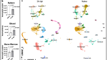 We took advantage in the relative difference between MPO and Ly6G expression levels in Ly6Glow and Ly6Ghigh neutrophils as determined by RNAseq expression analysis in order to distinguish these cells by immunofluorescence microscopy in the BM. Consistently, the MPO signal in immature Ly6Glow cells in the BM was high compared to mature Ly6Ghigh neutrophils which enabled the specific detection of immature neutrophils by immunofluorescence microscopy. Similarly, Ly6G staining detected specifically mature Ly6Ghigh neutrophils. As in the flow cytometry analysis, Ly6Ghigh neutrophils were completely absent from the BM of infected WT mice but were still present in infected TCRα-deficient BM (Fig. 9c, d). These findings indicated that neutrophil population changes occurred predominately at the late maturation stage, rather than during early differentiation, with a profound loss of mature Ly6Ghigh neutrophils. Importantly, the infection impacted predominately mature neutrophil populations and to a much lesser degree immature granulocytes and their progenitors, since the BM of symptomatic WT and asymptomatic TCRα-deficient contained relatively equal numbers of GMPs and immature neutrophils.