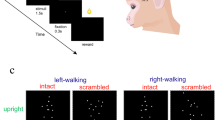 As noted above, both the contrast of the texture cue and the direction of pattern motion were varied across trials, with stimuli drifting either upward or downward on a given trial. This was done to minimize both psychophysical11 and neuronal28 adaptation effects. There was no significant effect of pattern direction on either the offset (point of subjective equality or PSE) (Wilcoxon rank-sum test; monkey N: z = 0.25, p = 0.8; monkey S: z = 0.86, p = 0.39) or threshold (Wilcoxon rank sum; monkey N: z = 0.14, p = 0.89; monkey S: z = 0.49, p = 0.62) of fitted functions (Fig. 2c). Furthermore, there was no significant difference between monkeys in the magnitude of texture contrast necessary to support a threshold level of performance (monkey N = 24.5% ± 3.9%, Monkey S = 18.9% ± 1.9%; Wilcoxon rank-sum, z = 1.01, p = 0.31).
