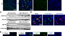 To determine whether biliary NIK is upregulated in mice with cholestasis, we placed C57BL/6J mice on DDC diet for 4 weeks and stained liver sections with antibodies to NIK and K19. We observed a few NIK+ cells and K19+ cholangiocytes in chow-fed mice (Fig. 1C). DDC feeding dramatically increased the numbers of NIK+ cells and K19+ cholangiocytes; importantly, the majority of cholangiocytes expressed NIK (NIK+K19+) (Fig. 1C). It is worth mentioning that NIK+K19+ cholangiocytes are likely to be underestimated because anti-NIK antibody may not recognize NIK at relatively low levels. In line with these data, DDC feeding markedly increased liver NIK mRNA abundance (Fig. 1D). ANIT feeding for 3 weeks (Supplementary Fig. 1B, C) or BDL for 7 days (Fig. 1E, F) also markedly increased NIK+K19+ cholangiocyte number, liver NIK mRNA levels, and ductular reaction. Thus, biliary NIK upregulation is a signature of biliary injury regardless of etiology.
