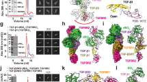The structure of αVβ8 headpiece in our αVβ8/L-TGF-β1 complex is almost identical to the reported ones either on its own or in complex with L-TGF-β119,31,32 (Supplementary Fig. 9b). In terms of L-TGF-β1, the entire integrin-binding regions were well resolved in the density map, allowing us to build the corresponding structure model (Fig. 3d). In our structure, the RGD tri-peptide (215−RGD−217) of L-TGF-β1 inserts into the cleft between αV β-propeller and β8 βI domains, similar to the reported αVβ8/L-TGF-β1 and αVβ6/L-TGF-β1 structures15,19,31. However, the adjacent proximal loop (207−INGFTTGR−214) and integrin-binding (IB) helix (218−LATIHGM−224) of L-TGF-β1 undergo tremendous conformational changes (Fig. 3e-g). Interestingly, rather than forming a continuous α-helix with 218−LATI−221, His222 of L-TGF-β1 flips outward and disrupts the secondary structure of the IB helix. Thus, we refer to the conventional IB helix as IB loop in our structure (Fig. 3e). The rotation of His222 breaks its hydrogen bond with the main-chain carboxyl group of Asn211, which helps to maintain the conventional proximal loop and IB helix structures in the 1:2 αVβ8/L-TGF-β1 complex19. Instead, in our 2:2 αVβ8/L-TGF-β1 complex, His222 is stabilized by Thr87 and His88 of L-TGF-β1, and His118 of integrin β8 through van der Waals interactions (Fig. 3f, g and Supplementary Fig. 9c). Moreover, Tyr172 of integrin β8 forms hydrogen bond with Thr212 to fix the proximal loop in the new position (Fig. 3f, g). This remodeling of proximal and IB loops of L-TGF-β1 leads to the movement of RGD motif by ~14 Å and the subsequent rotation of integrin αVβ8 by ~60 degrees compared to the reported αVβ8/L-TGF-β1 structure19 (Fig. 3h, i).