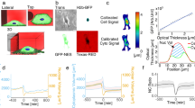 Droplet contour evolution in time was measured with a custom-built plugin Radioak for use in Fiji and available on https://github.com/gletort/ImageJFiles/tree/master/radioak. The plugin extracted the values of radii of a given selection for all angles around the selection center. Shape variation over time was measured by comparing the value of the radius relative to its average value for each angle. In Fig. 4a (upper right), contour fluctuation dynamics were represented visually with a color code: orange if the radius increased or decreased relative to the previous timepoint and white if stable when compared to a given threshold.