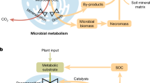 Soils were sampled at 8.9, 9.2, and 9.5 y after trial establishment. Intact soil cores (40 mm diameter) were sampled to 75 mm depth within each subplot, outside the respiration collars to reduce disturbance. Note that although 7.6 Mg biochar-C ha−1 was incorporated to 100 mm depth, soils were sampled to 75 mm depth because the trial originally started as an ‘agronomic assessment of biochar’ and the industry standard for pasture soil analysis was 0–75 mm sampling. Hence, the amount of biochar-C in the top 75 mm layer was estimated to be 5.7 Mg biochar-C ha−1 assuming no lateral movement of biochar. This may underestimate new SOC accumulation. Previously sampled areas were avoided in subsequent sampling events. Samples were mixed evenly and analyzed for pH, total SOC, and microbial biomass C (MBC). Total SOC was measured on an equivalent-mass basis using Dumas combustion60, and converted to soil C density using the bulk density of each biochar treatment. Soil pH was measured on soil suspensions (1:5 w/w soil:water) using an IntelliCAL PHC101 pH probe on a Hach HQ40d portable metre (Loveland, Colorado, USA). The metabolic quotients of total C or rhizodeposits were then quantified as the ratio of respiration (native SOC or 13C-labelled root respiration) over total MBC. The remaining soil was stored at −20 °C.