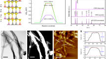 CZTS have been shown as an excellent sunlight absorber not only for solar energy conversion by photovoltaics but also for photocatalytic hydrogen evolution8,12,43,44,45. The synthesized hydrophobic ligand-capped polytypic CZTS could undergo ligand exchange with MPA before photocatalytic hydrogen evolution (Supplementary Fig. 26). The photocatalytic hydrogen evolution properties of polytypic CZTS nanocrystals were performed in a Pyrex reaction cell connected to a closed gas circulation with vacuum. Figure 3b shows the photocatalytic hydrogen evolution rate of the synthesized polytypic and phase-pure CZTS nanocrystals (Supplementary Fig. 27). The samples of double-homojunction and single-homojunction polytypic CZTS nanocrystals boost to a hydrogen production rate of 381 and 270 μmol h−1 g−1, respectively. Small hydrogen evolution rates (145 μmol h−1 g−1 for WZ nanocrystals and 98 μmol h−1 g−1 for KS nanocrystals) are obtained when phase-pure nanocrystals were used as photocatalysts. Apparent quantum efficiencies on DHP CZTS photocatalysts were tested at diverse light wavelengths in the same reaction solution, exhibiting a similar trend to that of the absorption spectra (Supplementary Fig. 28 and Fig. 3a). The best photocatalytic activity of DHP nanocrystals reveals that more homojunctions in polytypic nanocrystals result in better photocatalytic hydrogen evolution performance. The polytypic nanocrystals achieved superior photocatalytic activities compared to prior co-catalyst free CZTS photocatalysts (Supplementary Table 3). Figure 3c exhibits the durability for hydrogen evolution of polytypic nanocrystals. After six runs, no significant decrease for hydrogen evolution can be observed during the long-time irradiation under visible light. Corresponding TEM images, XRD patterns, and XPS spectra (Supplementary Figs. 29–31) after six runs of photocatalysis show no obvious change in morphology, phases and oxidation states of the SHP and DHP CZTS nanocrystals, which certify the high stability of SHP and DHP CZTS nanocrystals against photocorrosion.