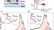 In order to probe the spin-valley physics of the IXs, we measured \({\sigma }^{-}\) circularly polarized PL as a function of out-of-plane magnetic field (Fig. 3a). In the DC region, we measured an exciton g-factor of \(7.0\pm 0.4\) (Fig. 3b), consistent with numerous past works on R-type MoSe2–WSe2 heterostructures7,20,21,22. In the hBN separated region, we measured an exciton g-factor of −5\(.4\pm 1.0\) (Fig. 3c), which has not been previously reported. We note that the opposite sign of the g-factor is consistent with our zero field circularly polarized measurements showing that the hBN separated PL has co-circularly polarized PL when pumping at 1.72 eV.