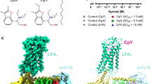 In 1996, LPA1 was the first identified LPA receptor10, and thus LPA-LPA1 signaling is the best-studied among the LPA receptors11. LPA1 couples to the G proteins such as Gαi, Gαq, and Gα12/13, and transduces various intracellular signals, e.g., increased Ca2+ concentration and actin reorganization by the Rho/ROCK pathway. LPA1 is widely expressed in several organs to control cell proliferation and survival, cell–cell contact, cell migration, and cytoskeletal morphological changes. The essential physiological functions of LPA1 are nervous-system tissue development and chondrocyte differentiation. LPA1 is associated with various diseases such as cancer, inflammation, and neuropathic pain, and thus is a pathologically important receptor that is an essential drug target. Because LPA1 signaling promotes cancer progression in many tissues12, LPA1 antagonists have been well studied as anti-cancer drugs. Moreover, some preclinical studies suggested the potential therapeutic value of selective LPA1 agonists for obesity13,14 and urinary incontinence14,15. However, the metabolic instability of LPA and its resultant short half-life have complicated the functional characterization of supplemented LPA16. Nonlipid LPA1–3 agonists are poorly reported, and thus identifying new potent and more stable agonists would be useful to explore and consolidate the potential therapeutic benefits of LPA receptors agonistic drugs. To date, the agonist-bound structures of the S1P receptors and CB receptors have been reported, revealing their lipid-ligand recognition mechanisms relevant for LPA13,17,18,19,20,21,22,23,24. While the antagonist-bound LPA1 inactive structure was also reported24, little is known about how LPA selectively activates the LPA receptors among the lipid-sensing GPCRs, limiting the design of drug-like LPA receptor agonists.