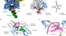 To biochemically verify whether SLFN11 dimerization is required for endonuclease activity, we performed an in trans complementation assay where the nuclease inactive SLFN11E214A was titrated to a constant and limiting concentration of SLFN11wt. The nuclease activity was increased with the addition of SLFN11E214A, while SLFN11E214A alone was inactive (Fig. 2h). This confirms that dimeric SLFN11 is the nuclease active species and that a single active site is sufficient for tRNA cleavage. A double mutant of dimer interface I located in the helicase domains (K591D, Y722A) did not influence tRNA cleavage while the introduction of a third mutation in dimer interface II (R82D) rendered the nuclease inactive (Supplementary Fig. 3g). In summary, dimerization of SLFN11 is necessary for substrate specificity and cleavage site orientation in the active site. In line with our results, it has been hypothesized that the ribonuclease activity of subgroup II Schlafen family member SLFN12 might be stimulated by dimerization25.