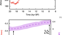 δ13C-CO2 was measured by dual inlet isotope ratio mass spectrometry at Oregon State University67. Air was extracted from ice using a dry extraction method in which vacuum canisters with abrasive grating surfaces were shaken at −65 °C for 1 h. The estimated grating efficiency was 70–90% based on measuring the mass of the intact sample and the mass of the ungrated pieces of ice left in the canisters after shaking. A typical extraction yielded 22 cm3 STP of air. The CO2 was purified using a −196 °C cryotrap cooled with liquid nitrogen. The trap consisted of a ¼” outer diameter, stainless steel cold finger fitted to a Swagelok valve that allowed the apparatus to be sealed and disconnected manually from the vacuum line. The cold finger was subsequently attached to a dual inlet MAT 253 mass spectrometer fitted with a microvolume inlet, and CO2 was transferred to the micro-volume at −196 °C. The 13C/12C ratio was measured against a pure CO2 working reference gas (Oztech). The δ13C-CO2 of the working reference was determined to be −10.51‰ relative to NBS-19. For each sample, a small aliquot of whole air was captured in a stainless-steel tube in a cryostat at 12 K prior to CO2 separation. The air aliquot was analyzed for CO2 concentration using an Agilent gas chromatograph with a Ni catalyst coupled to a flame ionization detector, similar to the system described by Ahn et al.68. CO2 concentration measurements were calibrated to the WMO 2007 scale69,70 by measuring standard air from Niwot Ridge, Colorado with known CO2 concentration. The INSTAAR Stable Isotope Laboratory, Colorado calibrated the δ13C-CO2 of the standard air to the VPDB-CO2 scale by measuring it against NBS-19. Measuring the standard air against the Oztech working reference gas permitted one-point calibrations of ice core sample air measurements to the VPDB-CO2 scale67. Care was taken to match the size of samples and standards to avoid introducing linearity artifacts.