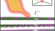 Or alternatively, we can obtain the second-order nonlinear electric field from \({J}^{(2)}\) by Ohm’s law \({E}^{(2)}=\rho {J}^{(2)}\) and \(\rho=\left(\begin{array}{ccc}{\rho }_{{{{{{\rm{b}}}}}}} & 0 & 0\\ 0 & {\rho }_{{{{{{\rm{a}}}}}}} & 0\\ 0 & 0 & {\rho }_{{{{{{\rm{c}}}}}}}\end{array}\right)\) is resistivity matrix for anisotropic MoTe2. Thus \({E}^{(2)}=\left(\begin{array}{c}{\rho }_{{{{{{\rm{b}}}}}}}({d}_{11}{E}_{{{{{{\rm{x}}}}}}}^{2}+{d}_{12}{E}_{{{{{{\rm{y}}}}}}}^{2})\\ 2{\rho }_{{{{{{\rm{a}}}}}}}{d}_{26}{E}_{{{{{{\rm{x}}}}}}}{E}_{{{{{{\rm{y}}}}}}}\end{array}\right)\). For an in-plane current \(J=j\left(\begin{array}{c}{{\cos }}\theta \\ {{\sin }}\theta \end{array}\right)\) of magnitude j and angle \(\theta\). The first order electric field is \(E=j\left(\begin{array}{c}{\rho }_{{{{{{\rm{b}}}}}}}{{\cos }}\theta \\ {\rho }_{{{{{{\rm{a}}}}}}}{{\sin }}\theta \end{array}\right)\). The component parallel to \(J\) is \({E}_{||}=j\left({\rho }_{{{{{{\rm{b}}}}}}}{{{\cos }}}^{2}\theta+{\rho }_{{{{{{\rm{a}}}}}}}{{{\sin }}}^{2}\theta \right)\). While the transverse component is \({E}_{\perp }^{(2)}={j}^{2}{\rho }_{{{{{{\rm{b}}}}}}}^{3}{{{\sin }}}^{2}\theta ({d}_{12}{r}^{2}{{{\sin }}}^{2}\theta+\left({d}_{11}-2{d}_{26}{r}^{2}\right){{{\cos }}}^{2}\theta )\). \(r\) is resistivity ratio defined \(r\equiv \frac{{\rho }_{{{{{{\rm{a}}}}}}}}{{\rho }_{{{{{{\rm{b}}}}}}}}\). Thus, we can obtain