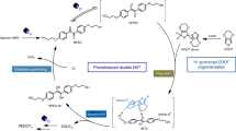 Scanning electron microscopy (SEM; Supplementary Figs. 14–21) images showed that the solid DCPs consisted of small particles with similar morphologies and microscale sizes, independent of the hydrophilic non-conjugated segments. The water contact angles of the EG-Br, TEG-Br, HEG-Br, and EA-Br monomers were 95.7°, 82.1°, 47.4°, and 76.7°, respectively (Supplementary Fig. 22), where HEG-Br had the highest hydrophilicity (lowest contact angle). Interestingly, we measured the contact angles of water drop on all of the DCPs films promptly, and observed hydrophobic behavior with the contact angles of ~109° (Supplementary Fig. 23), which were in contrast to most side-chain-engineered CPs that show hydrophilic behavior19,20,21,22. We considered that the high density packing of polymer chains in the films results in non-obvious differences in water contact angles between DCPs and PFBPO. To further understand the difference of the hydrophilicity between the DCPs and PFBPO, the particle size distributions of the polymers in a non-aqueous (toluene), aqueous (pure water), and mixture solution (33.3 vol.% H2O/33.3 vol.% MeOH/33.3 vol.% TEA) were determined by dynamic light scattering (DLS). As shown in Supplementary Fig. 24, all of the DCPs showed smaller hydrodynamic diameters than PFBPO in toluene, indicating that the DCPs have higher solubility in non-aqueous solution. We considered it is because the insertion of the non-conjugated hydrophilic segments to the polymer backbone will reduce the packing of the polymers. In addition, the polymers showed larger hydrodynamic diameters in pure water (Supplementary Fig. 25) than in the mixture solutions (Supplementary Fig. 26), because there is no organic solvent to help the dissolution of the polymers. Importantly, in both pure water and mixture solutions, all the DCPs showed larger hydrodynamic diameters than PFBPO due to swelling phenomena in aqueous solution28,29.