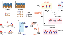 Since Cu(100) surface has been identified as the major active facet under similar reduction reaction conditions, we compare our results from AIMD simulations with experiments conducted on copper-based catalysts43. The most significant agreement between previous experiments and our theoretical prediction is that ammonia is the major product but not N2O or N2 in neutral electrolyte17,44,45. This can be explained by the ultra-low barrier of *N protonation to NH* (0.21 eV), and such a low barrier inhibits *N coupling with another *N or *NO to form N2 and N2O, respectively. We found that in pathway iii), *NH2OH is a key intermediate toward the formation of ammonia. These results are in accordance with the recent report that *NH2OH was detected as an intermediate during nitrate reduction to ammonia on copper-based materials by online differential electrochemical mass spectrometry45. However, Pérez-Gallent et al. found that hydroxylamine (NH2OH) is the final product for nitrate reduction on Cu(100) in alkaline media46. One possible explanation is that this pathway is sensitive to pH as well as the applied electrode potential. To validate pathways i) and ii), determination of intermediates like *NH or *NHOH via spectroscopy-based characterization is still challenging, and we believe that a combination of electrochemical measurements coupled with in situ characterization techniques as well as advanced atomic simulation methods would benefit determination of the complex reaction mechanisms47,48.
