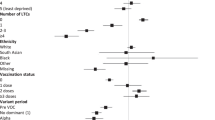 Socioeconomic deprivation was obtained from postcode of residence using the Scottish Index of Multiple Deprivation derived from aggregated data on: income, employment, education, health, access to services, crime and housing23. SARS-CoV-2 variants were defined as dominant if they accounted for ≥95% of cases genotyped that week (https://sars2.cvr.gla.ac.uk/cog-uk/). Pre-existing health conditions were ascertained from self-report, previous hospitalizations and dispensed prescriptions. Respiratory disease was defined as International Classification of Diseases 10 (ICD10) codes J40-J47, J98.2 or J98.3, or bronchodilators, inhaled corticosteroids, cromoglycate, leukotriene or phosphodiesterase type-4 inhibitor (British National Formulary (BNF) 3.1–3.3), or self-report. Coronary heart disease was defined as ICD10 codes I11.0, I13.0, I13.2, I20-I25 (excluding I24.1), I50, T82.2, or Z95.5, or self-report. Depression was defined as ICD10 codes F30-F33, or anti-depressant, hypnotic or anxiolytic (BNF 4.1;4.3), or self-report. Diabetes was defined as ICD10 codes E10-E14, G590, G632, H280, H360, M142, N083, O240-O243 or self-report24. The total number of self-reported health conditions was categorised as 0, 1, 2–3 or ≥4.