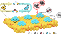A schematic of ATR-SEIRAS setup consisting of two chambers with three electrodes is shown in Supplementary Fig. 26, 3 mL and 10 mL of 0.1 M NaClO4 electrolyte was injected into anodic and cathodic chamber, respectively. Cu powder electrode was used as the working electrode. Pt foil was used as the counter electrode and reference electrode was the same as that used in Raman tests. Anode chamber and cathode chamber were separated by Nafion membrane to prevent the interference from Pt CE reported by Dunwell et al.53. No electrolyte flow was applied in our ATR-SEIRAS tests. An INVENIO R FT-IR (Bruker) spectrometer equipped with a MCT detector was used for the in-situ ATR-SEIRAS test and all spectra were given by the absorbance (−log (R/R0)). The spectral resolution was 4 cm-1 and the scanning time was 30 s for each spectrum. All the potentials were converted to be on RHE scale.