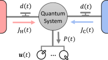 The working substance of the quantum Otto engine we implement here is a pseudo-spin 1/2 represented by the internal states of a trapped single 40Ca+ ion, i.e., the ground state \(|{4}^{2}{S}_{1/2},{m}_{J}=+ 1/2 \rangle\) labeled as \(|g \rangle\), and the metastable state \(|{3}^{2}{D}_{5/2},{m}_{J}=+ 5/2 \rangle\) labeled as \(|e \rangle\), with the magnetic quantum number mJ (see Fig. 1A). In our experiment, we confine a single 40Ca+ ion in a linear Paul trap, whose axial and radial frequencies are ωz/2π = 1.1 MHz and ωr/2π = 1.6 MHz, respectively. We define a quantization axis along the axial direction by a magnetic field of ~3.4 Gauss at the center of the trap. We then perform Doppler and sideband cooling of the ion until an average phonon number of \(\bar{n} \, < \,1\) with the Lamb-Dicke parameter ~0.11 is achieved. This is sufficient to avoid thermal phonons yielding offsets of Rabi oscillations40,41,42, and thus observe quantum effects 42. Populations of different energy levels of the qubit are detected using a photomultiplier tube (PMT) that monitors the fluorescence due to spontaneous decay from the excited state41. In our experiment, we observe the variation of the population in \(\left|e\right\rangle\), from which the required thermodynamic quantities, such as work, output power and efficiency, can be acquired. The temperature T and the entropy S of a spin system are defined as \(T=-{\Delta }_{{{{{{{{\rm{0}}}}}}}}}{[{k}_{{{{{{{{\rm{B}}}}}}}}}\ln ({P}_{{{{{{{{\rm{e}}}}}}}}}/{P}_{{{{{{{{\rm{g}}}}}}}}})]}^{-1}\) and S = − kBTr\([\rho \ln \rho ]\), where Pe and Pg denote the populations of the states \(\left|e\right\rangle\) and \(\left|g\right\rangle\), respectively, Δ0 = Ee − Eg is the effective energy gap between the states \(\left|e\right\rangle\) and \(\left|g\right\rangle\) in the interaction representation, kB is the Boltzmann constant, and ρ is the density operator describing the state of the system.