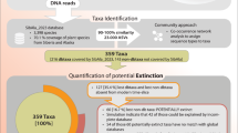In the 16S data set, we determined final taxonomic assignments based on scrutiny of NCBI BLAST97 hits and comparison to known temporal biogeographic distributions (full justifications are given in Supplementary Data 3). Data for 16S sequences assigned to the same taxon were collapsed. We discarded all off-target and non-mammalian sequences, as well as those assigned as human (Homo sapiens) or wild boar (Sus scrofa), as the former is a common contaminant (also found in the negative controls) and the latter cannot be differentiated from sympatric domestic pig at this locus (Supplementary Data 3). Although absent from the negative controls, we note that domesticated taxa (pig, cow, sheep, goat) can be sources of sporadic PCR contamination98. Although we retained detections from all samples, we interpret sporadic occurrences of these taxa, defined as single, isolated PCR replicate detections, as likely deriving from contamination. We note that these occur in otherwise low diversity samples that are most at risk of sporadic contamination detections (e.g., sheep at 6.1 ka; cow at 7.4, 9.1, ~12.7 ka) (Fig. 3 and Supplementary Fig. 9).