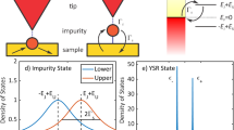 Here the first two terms represent the BCS superconducting state of Pb. The third and fourth terms represent the two (i = 1,2) ligand orbitals of Tb2Pc3. The fifth term is the hybridization between the molecular orbitals and the Pb substrate, where the hybridization strength is \({\varGamma }_{i}^{S}=\pi {V}_{i}^{2}{\rho }_{i}\). The final term corresponds to the coupling between the spins in the two orbitals. Other notations are standard. The STM tip height determines the substrate-molecule and molecule-tip distances. The hybridization of the molecular orbitals with the tip is much smaller than that with the substrate, \({\varGamma }_{i}^{T}\,\ll\, {\varGamma }_{i}^{S}\), thus the YSR energies are determined by \({\varGamma }_{i}^{S}\), while \({\varGamma }_{i}^{T}\) determines the contribution of both orbitals to the total tunneling current, which is calculated via Bardeen’s approach from the orbital spectral functions. The model is schematically shown in Fig. 4d. The impurity problem is solved using the NRG method38,39. In this model, the ratios \({\Gamma }_{i}^{s}/{U}_{i}\) governs the physical properties. We consider the situation in which the 1st orbital is in the local-moment regime with \({U}_{1}/\pi {\varGamma }_{1}^{S} > 1\), and the 2nd orbital in the valence-fluctuation regime with \({U}_{2}/\pi {\varGamma }_{2}^{S} < 1\). While the spin in a valence-fluctuating orbital is not well defined, it still creates YSR states40,41,42,43, because of its wavefunction component with single electron occupancy. The calculations were performed in the wide-band limit for parameters \({U}_{1}/\varDelta=100\), \({U}_{2}/\varDelta=10\), \({\varepsilon }_{1}/\varDelta=-25\), \({\varepsilon }_{2}/\varDelta=-4\), with fixed large hybridization for \({\varGamma }_{2}^{S}/{U}_{2}=0.375\) and variable hybridization for \({\varGamma }_{1}^{S}/{U}_{1}\) in the range 0.06–0.092. Furthermore, we set \(J/{U}_{1}=-0.005\), which corresponds to a weak yet non-negligible Hund’s coupling, presumably due to the nearly orthogonal symmetry of the two LUMO states. We assume that both \({\varGamma }_{1}^{S}\) and \({\varGamma }_{2}^{T}\) exponentially depend on Z, i.e., \({\varGamma }_{1}^{S}\sim {{{{{{\rm{e}}}}}}}^{-{\kappa }_{1}^{S}Z}\) and \({\varGamma }_{2}^{T}\sim {{{{{{\rm{e}}}}}}}^{-{\kappa }_{2}^{T}Z}\), and that \({\kappa }_{2}^{T}/{\kappa }_{1}^{S}=12\). This empirical model is based on the measured dI/dV data, showing variation of inner peak positions, while the outer peak positions are nearly constant. The simulation results shown in Fig. 4e reproduce the measurements from Fig. 3c rather well, supporting our model. This indicates that the valence-fluctuating orbital experiences inter-orbital coupling to the local moment, and the inner (outer) YSR pair originates from spin (orbital), because it closely (slightly) evolves with the changing Kondo temperature. As such, this new type of YSR excitation is dubbed as spin-orbital YSR state. The spin-orbital YSR state should be generic to molecules experiencing orbital degeneracy lifting and charge transfer upon substrate adsorption. The simulation also highlights the dual role of the tip height in this system, affecting either molecule-substrate or molecule-tip coupling for either orbital.