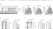 In IRA43+Ins, L1 interacts with FnIII-2 and FnIII-2’, and complex formation brings FnIII-3 and FnIII-3′ into close proximity (Fig. 4b–d). Moreover, A43 binding to IR potentiates the phosphorylation of all Tyr residues of IR induced by insulin30. Therefore, we surmised that the small difference in the distance between parallel FnIII-stalks regulated by the L1 and FnIII-2/FnIII-2′ interaction is a critical structural factor determining the transition from m-pY1150 to full activation (Fig. 4d). To investigate the role of the translocation of L1 opposite the insulin binding module, we introduced F64A or R702Y/T704W mutations, which we expected to disrupt or augment the L1–αCT′ interaction, respectively, into a single protomer22,23,34,37. We also attached yellow fluorescent protein (YFP) to the C-terminus of one protomer, and transfected a 1:1 mixture of YPF-tagged IR and untagged IR to distinguish the phosphorylation state of each protomer (Fig. 4e and Supplementary Fig. 10a). While insulin fully activated the wild-type (WT) + WT/YFP hybrid receptor, both F64A and R702Y/T704W mutations completely inhibited IR phosphorylation by disrupting insulin binding (Fig. 4e, f). In the WT + F64A/YFP hybrid receptor, asymmetric insulin binding induced m-pY1150 in YFP-tagged IR (upper bands) to the same degree as in the WT + R702Y/T704W/YFP hybrid receptor. However, phosphorylation of other Tyr residues was significantly reduced only in the WT + F64A-YFP hybrid receptor in which the L1–αCT’ interaction opposite the insulin-binding module is disrupted.