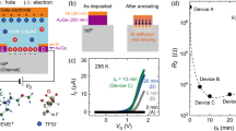 As illustrated in the cyclic voltammograms (CV) of GPE ionic diode in Fig. 4a and homojunction in Supplementary Fig. 6, no redox reaction peak or electrochemical reaction could be observed, owing to good stability and wide electrochemical window of PC solvent and ionic liquids. In addition, the magnitudes of current density obtained in all CV curves are well below the cut-off limit of 0.1 mA/cm2 selected to identify the electrochemical window34. Therefore, this can verify that the GPE ionic diode is stable within the working range from − 2.0 V to 2.0 V without involving any electrochemical reaction (non-faradaic) or obvious electrolysis. In this regard, the high rectifying ratio of our device can be solely attributed to the current signals produced by ion diffusion and migration, without participation of a redox process. To further verify this, X-ray photoelectron spectroscopy (XPS) has been employed to chemically characterize the GPE ionic diode after applying voltages at − 2 V and 2 V for 10 s. As shown in Supplementary Figs. 4 and 5, the XPS analysis of PAZT and PHEC reveals that all the characteristic peaks correspond well with the ionic liquid, salt and polymer employed, without a trace of redox byproducts, which is in line with the CV results.